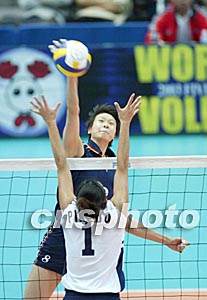 2003年11月9日,中國女排在日本富山進行第九屆女排世界杯賽比賽中,以3比0擊敗阿根廷隊,取得了七連勝。圖為趙蕊蕊快球進攻。中體在線/供圖