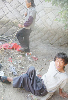 12月6日記者采訪了戴家。戴家的兩位老人已經去世多年。扔下了4個殘疾孩子和老母親。戴家的長子戴清鎮,37歲,患有精神病,經常發作。記者沒有看到他,據隨行的村干部說他已經離家出走多日,音訊全無;二兒子戴金龍,30歲,癡呆,沒有任何勞動能力;三兒子戴振明,28歲,小兒麻痹,完全癱瘓;四兒子戴暫缺,25歲,手拄雙拐。唯一的健全人是35歲的戴雙治。她和丈夫擔負起了照顧全家的重擔。