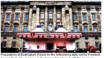 與此同時,英國人的抗議活動逐漸升級。昨天傍晚,警方逮捕了一名爬上白金漢宮大門的抗議者。她名叫林迪斯·普爾西,她在下午四點鐘的時候爬上大門把一幅美國國旗倒掛在上面。國旗上還寫著抗議布什訪英的標語。她在被警方逮捕之前在大門上坐了兩個小時。