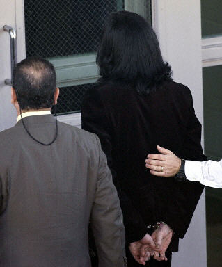 接近美西時間中午時分,邁克爾-杰克遜在雙手被手銬銬住的情況下,由警方和私人律師陪同進入圣巴巴拉警察局。