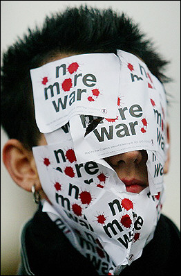一名抗議者在臉上貼滿反對伊戰(zhàn)的標(biāo)語。
