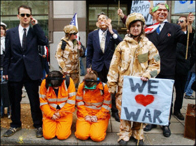 示威者裝扮成秘密警察(左)與關塔那摩囚犯