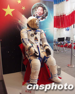 中國首飛航天員楊利偉在太空之旅中穿過的航天服在此次展會上亮相。中新社記者 余瑞冬攝