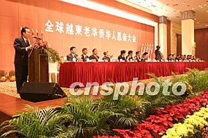 十一月二十五日,國務院僑辦主任陳玉杰在廣州東方賓館召開的全球越柬老華僑華人懇親大會上,代表中央“五僑”祝賀大會的勝利召開。中新社記者:史利