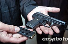 北京東城警方將持槍入室搶劫達(dá)二十一萬元人民幣的犯罪嫌疑人蔡某(男)及同案犯押解回京,并收繳案犯使用的仿64式真彈手槍及子彈。中新社記者:任海霞