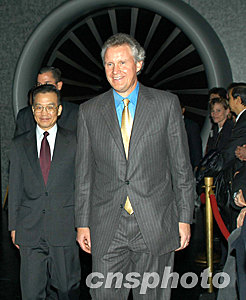正在紐約訪問的中國總理溫家寶美東時間十二月八日下午,在美國通用電氣公司總裁兼首席執行官伊梅爾特(右)陪同下,參觀美國通用電氣公司。中新社記者:趙海燕