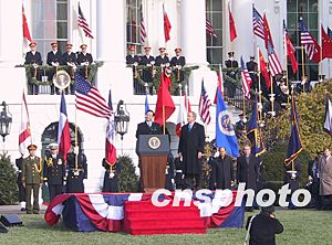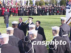 布什與溫家寶在白宮南草坪歡迎儀式上檢閱軍樂隊行進表演。中新社記者 余東暉 攝
