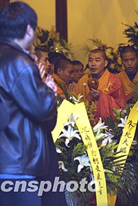 數(shù)十只兩岸三地各界贈送的花圈、花籃把整座三圣殿周邊裝點得分外肅穆,柯受良身著紅西服的半身遺像端放在正殿右側,上端蓋有黑紗,前端放有寫著“佛力超度柯受良先生”的明黃色牌位。根據(jù)家屬意愿,由法師按中國傳統(tǒng)的佛教禮儀為其超度,其親朋依次入殿默哀致意。