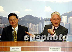 香港刑事檢控專員江樂士[右]資深大律師,12月15日在記者會上公布,就前財(cái)政司長梁錦松在二○○三年度財(cái)政預(yù)算案增加首次登記稅前買車一事,決定不向他作出檢控。作者:洪少葵