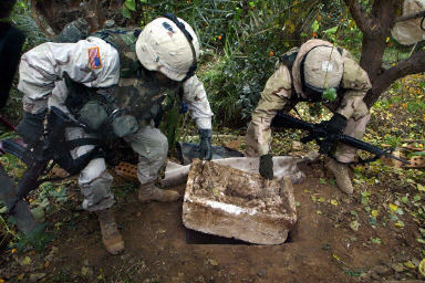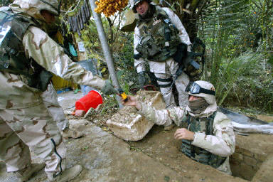 12月15日,在伊拉克提克里特附近,美軍第四步兵師士兵展示薩達姆被捕時藏身的地洞。