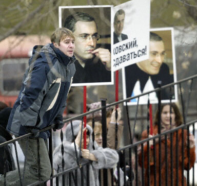 12月23日,一些霍多爾科夫斯基的支持者在俄羅斯莫斯科一地區(qū)法院門前等待法院對其作出的裁決。當(dāng)日,該法院作出裁決,繼續(xù)羈押尤科斯公司前總裁、俄羅斯首富霍多爾科夫斯基至2004年3月25日。霍多爾科夫斯基是2003年10月25日被俄總檢察院逮捕的。俄總檢察院指控他涉嫌巨額逃稅和侵吞國家資產(chǎn)等7項罪名。
