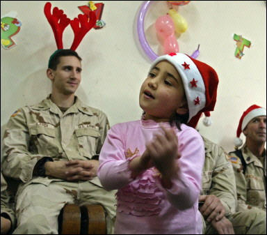 一支合唱團在美兵的各個慶祝地點穿行,帶領士兵們齊唱贊美歌。而作為迎接圣誕夜的重頭戲,駐伊美兵與伊拉克兒童一起舉行了歌舞比賽。
