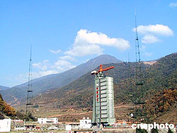 中國“雙星計劃”首發星箭組合體——“探測一號”衛星和“長征二號丙”改進型運載火箭在西昌衛星發射中心整裝待發。 中新社記者 孫自法 攝
