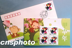 2004年是甲申年,按中國(guó)十二生肖排序?yàn)楹锬辍1本┦朽]票公司為配合國(guó)家郵政局在2004年1月5日發(fā)行《甲申年》特種郵票(生肖猴票、1套1枚),特設(shè)計(jì)和印制了該郵票的首日封(左)、郵折(右)等郵品,與郵票同時(shí)發(fā)行。《甲申年》特種郵票面額是80分。中新社記者:鄒憲