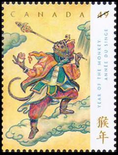 此次發(fā)行的猴年郵票,包括面值為加拿大國(guó)內(nèi)郵資4角9分的郵票共800萬(wàn)枚,以及面值為國(guó)際郵資1元4角的郵票共170萬(wàn)枚,設(shè)計(jì)圖構(gòu)思都取自中國(guó)古典小說(shuō)《西游記》中的西天取經(jīng),圖案分別為孫悟空大戰(zhàn)玉皇大帝、以及悟空向師傅悔過(guò),上有中文“猴年”和英文Year of the Monkey字樣。