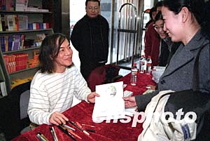 臺灣著名幽默漫畫家朱德庸一月十日在北京圖書大廈為讀者簽售他的漫畫集,現場他根據每位讀者的要求和特點即興創作漫畫,使每一位讀者都得到了獨一無二的漫畫簽名。作者:徐曦弋