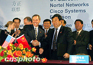 由中國信息產(chǎn)業(yè)部副部長婁勤儉帶隊(duì),由中國電信、中國移動、中國聯(lián)通、北大方正以及聯(lián)想電腦等企業(yè)組成的電子信息產(chǎn)品采購團(tuán)于美國時間十一日到達(dá)美國,媒體報道,這次簽約的合同達(dá)二十三億多美元。