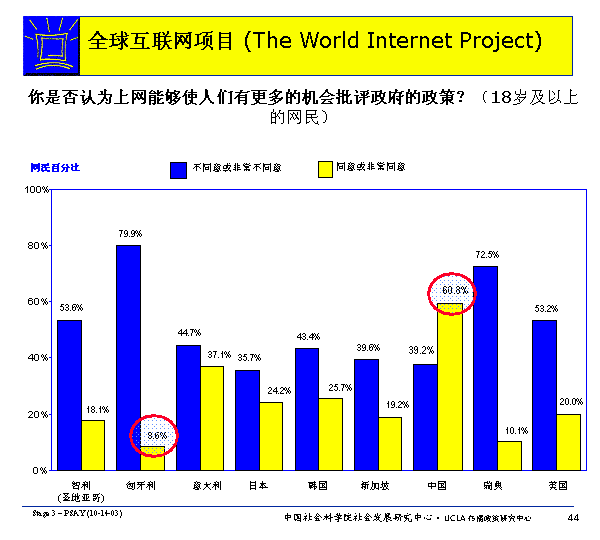 大多數人不相信互聯網可以使人們有更多的機會批評政府的政策。只有8.6%的匈牙利人同意或非常同意上網可以使人們對政府工作有更多的發言權。而意大利的網民中有37.1%的同意或非常同意這一點。