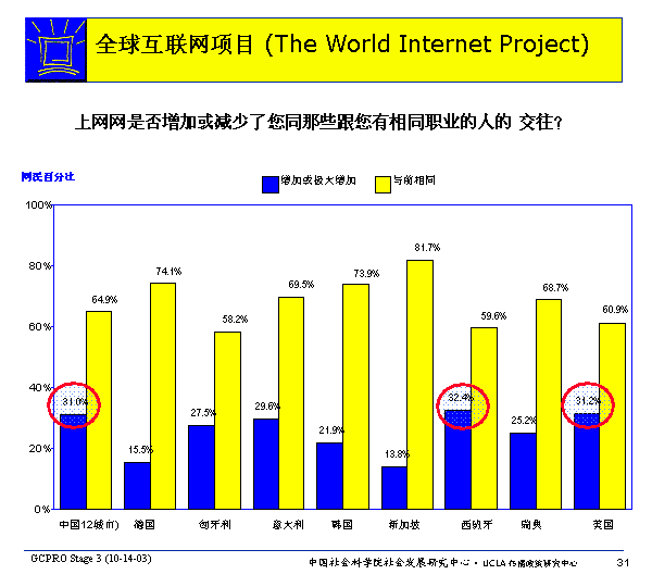 用網沒有改變大多數網民同那些從事相同職業的人的交往數量。相當數量的網民報告他們用網增加了與這些人的交往;這類網民最多的是在西班牙,32.4%的網民報告他們增加或極大增加了同這類人的交往。