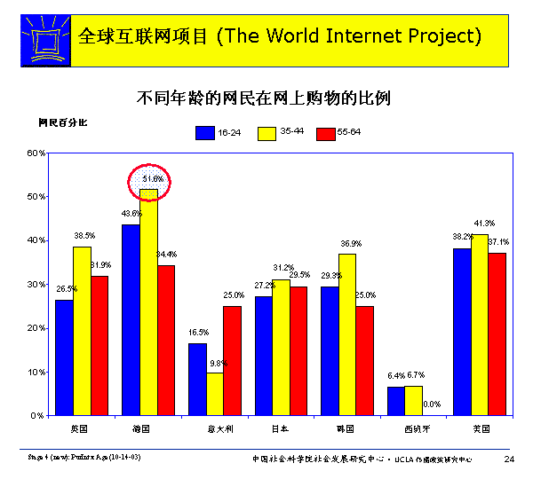 除意大利外,通常中年人更愿意在網上購物。所有國家35-44歲之間的網民比16-24歲或55-64歲之間的網民更可能上網購物。