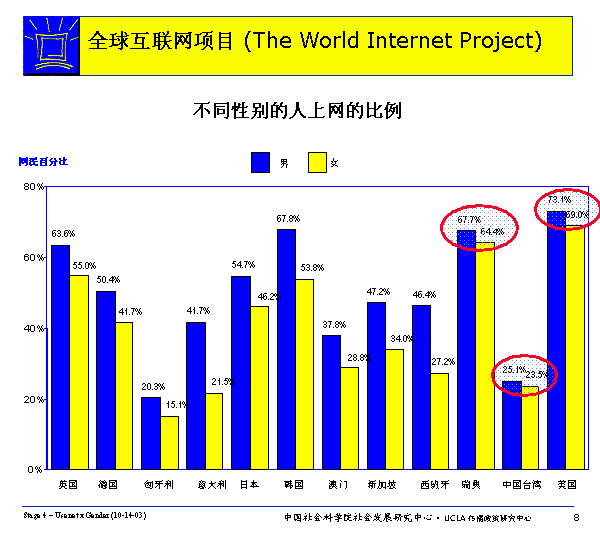 在WIP所有國家里,男性比女性更可能上網。男性和女性上網比例的差異因國家而異,瑞典、臺灣和美國的男女上網比例幾乎沒有差異,而意大利、新加坡和西班牙的男女上網比例則差異很大。