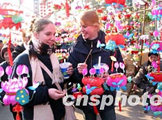 一月二十七日(正月初六)陽光明媚,南京夫子廟燈卉大市場異常火爆。在南京過“中國年”的德國留學生任寧寧和好友相約,利用假日逛起了燈卉大市場,選購中意的花燈,她們邊走邊交流在中國過年的感受。作者:丁東升