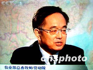 中國農業部總畜牧師賈幼陵日前在接受中央電視臺采訪時表示,中國正進一步完善突發高致病性禽流感疫情應急機制,建立和完善快速反應體系。圖為賈幼陵接受采訪時的電視畫面。中新社記者:賈國榮