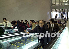澳門新關閘邊檢大樓二日開始啟用,為了充分利用現有的空間,新邊檢大樓分為上下兩層,出境的旅客需通過扶梯從二樓前往出境大廳。中新社記者:李剛