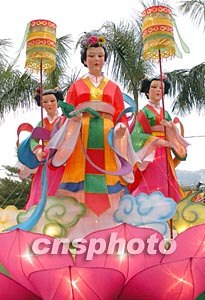 元宵佳節臨近,香港康文署在尖沙咀文化中心露天廣場舉行大型彩燈《華燈話西游》,圖為取材自《西游記》中的“西王母幡桃壽宴”,西王母慈祥地拿著玉如意站在蓮花上。作者:鄧慶樂