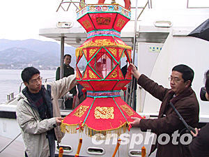 二月四日,馬尾民間節人制作的七盞大花燈在馬尾港由有關人員搬上馬祖“閩珠二號”,準備參加馬祖元宵燈會。今年元宵佳節,馬祖、馬尾將第二次共同舉行“兩馬”鬧元宵燈會活動。作者:劉可耕