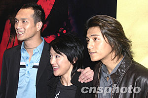 2月5日下午,電影《戀愛中的寶貝》在北京舉行首映新聞發布會。這部影片融合了中國電影第五代最前衛的藝術思考與風格創新。正式放映之前就獲得包括威尼斯電影節、柏林電影節、墨爾本電影節、意大利遠東電影節、香港電影節等各大電影節的邀請。被稱為中國內地2004年最值得期待的第一部國產大片。圖為影片的三名主要演員:黃覺、周迅、陳坤(從左到右)。作者:高遠