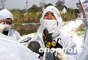 中外十四名記者,十二日深入中國內(nèi)地首發(fā)禽流感疫點(diǎn)--隆安縣丁當(dāng)電灌站采訪。中新社記者:宋吉河