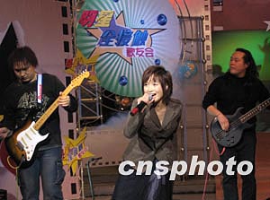 2月13日下午,亞洲搖滾新天后斯琴格日樂(lè)在山西太原電視臺(tái)“明星全接觸”舞臺(tái)上高歌。作者:張?jiān)?