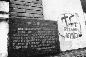 2月16日,記者(注:人民日報(bào)記者)在天津民主道23號曹禺舊居院墻上看到,緊挨著天津市文物局和天津市河北區(qū)文物管理所等單位懸掛的兩塊曹禺舊居紀(jì)念牌的,是一個(gè)約60厘米高的墨寫的“拆”字(如圖),旁邊還張貼著花花綠綠的各類“搬家公司”的小廣告。旁邊有的住家已人去樓空,三三兩兩收破爛的外地人正在曹禺故居外來回轉(zhuǎn)悠。