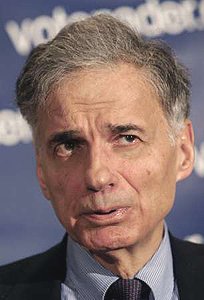 本周即將年滿七十的納德二000年曾經(jīng)以綠黨候選人的身份參與總統(tǒng)大選角逐,雖然僅獲得百分之二點(diǎn)七的選票,但因?yàn)椴际苍诜鹆_里達(dá)和新罕布什爾兩州僅以微弱的優(yōu)勢壓倒戈?duì)枺〉眠@兩州的選舉人票而登上總統(tǒng)寶座,民主黨人認(rèn)為納德的得票分流了本來支持戈?duì)柕倪x民,導(dǎo)致戈?duì)柭鋽 ?div align="left">