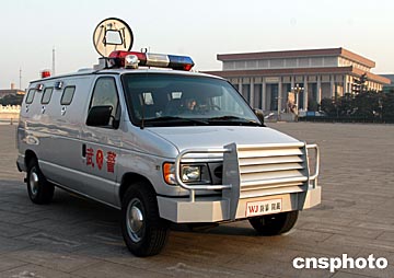 執(zhí)行“兩會(huì)”安全保衛(wèi)的武警新式防暴車在北京天安門廣場(chǎng)執(zhí)勤。中新社記者:張宇
