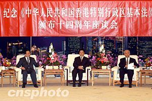 盛華仁說,香港基本法頒布十四年來的歷史表明,這部法典的偉大意義在于,它把鄧小平關于“一國兩制”的偉大構想,用法律形式完整地體現出來,并在香港成為事實。依照基本法所開創的“一國兩制”的生動實踐,是世界歷史上前所未有的偉大創舉。事實證明,香港基本法是香港長期繁榮穩定的根本保證。
