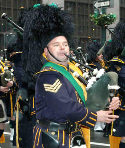 十七日,雖然嚴寒,卻沒有影響紐約愛爾蘭人慶祝節日的興致,愛爾蘭風笛手仍舊穿著花格短裙沿著曼哈頓五大道緩緩行進。引人注目的還有游行隊伍中身著迷彩服的美國戰士,這是往年并不多見的一只隊伍,美伊戰爭后,這只隊伍成為美國愛爾蘭裔人的驕傲。