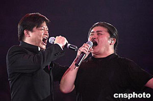 “歡歌2004演唱會”在座無虛席的首都體育館隆重上演,中國內(nèi)地歌手劉歡(右)與特邀嘉賓香港歌手莫華倫一起為到場歌迷獻上了眾多耳熟能詳?shù)母枨。作?高遠