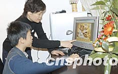 四月四日清明節,福建一對母子在家中“上網”參與由中國某網站舉辦的“炎黃子孫網上共祭”活動,輕點鼠標獻花祭先賢。作者:劉可耕