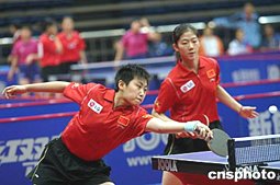 四月十二日,在北京海淀體育館進行的奧運會乒乓球亞洲區預選賽女子雙打第一階段比賽結束,中國選手郭躍(左)、牛劍鋒以不敗戰績進入第二階段。中新社記者:盛佳鵬
