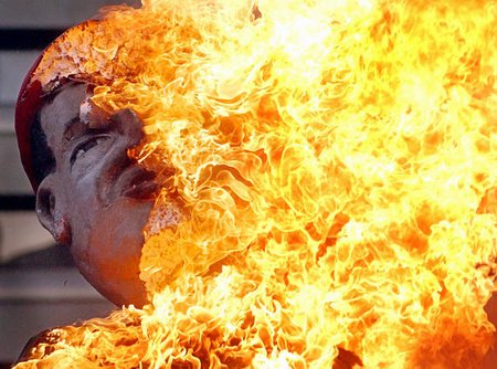中新網4月13日電 據路透社報道,4月11日,委內瑞拉總統查韋斯的反對者正在首都加拉加斯燃燒這位左翼領導人的肖像。兩年前的4月11日,一場短暫的政變將查韋斯暫時推翻下臺。委內瑞拉政府和反對派相互指責對方是導致這場政變引發的暴亂當中數十人死亡的罪魅禍首。(春風)