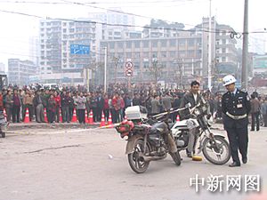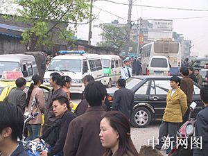 今晨,重慶天原化工廠發生氯氣泄漏事件,重慶市政府緊急疏散上萬當地群眾。圖為重慶市政府緊急調集的車輛正在往安全地帶輸送群眾。作者:郭晉嘉  重慶市政府在離事發地兩公里的地方拉起的警戒線外圍觀的群眾。作者:郭晉嘉