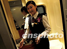 中國第五次提速列車上的衛生間改動最大,加裝了整容鏡、緊急呼叫按鈕等,并首次采用了全新的環保理念,變普通列車的排泄式為集便式,到終點站后統一由保潔公司處理。圖為乘務員向旅客介紹新廁所使用。中新社記者:王麗南