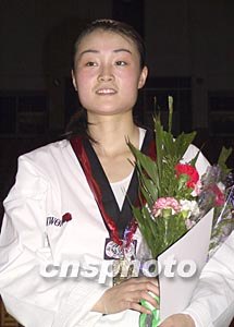 二○○四年全國跆拳道錦標(biāo)賽暨奧運(yùn)會(huì)資格選撥賽四月二十一日晚在海南海口體育館舉行五十九公斤級(jí)決賽,曾獲得世界冠軍的解放軍隊(duì)選手王朔,獲得五十九公斤級(jí)冠軍,并獲得雅典奧運(yùn)會(huì)參賽資格。作者:王辛莉