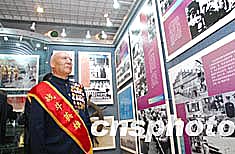 為紀念解放軍東海艦隊成立五十五周年,寧波市各階籌款數百萬元為艦隊建起了一座現代化的軍史館。五十五年前的4月23日,東海艦隊前身——解放軍華東軍區海軍在江蘇泰州白馬廟成立。圖為見證艦隊光輝歷程的戰斗英雄王維福在軍史館參觀。作者:鐘魁潤