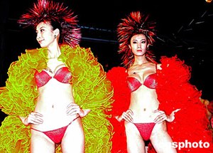 五月,著名的黛安芬內衣公司將全面上市2004“危險曲線”內衣新品。圖中模特展示的是新品內衣“奢華曲線”情景,這款內衣淡淡的桃紅色內襯著純白的刺繡蕾絲,晶扣設計搭配低胸剪裁,奢華中盡展女性的嫵媚。中新社記者:王麗南