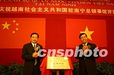 中新社南寧五月二日電(記者 劉萬強 蔣雪林)越南駐南寧總領事館今天舉行開館儀式,廣西自治區副主席李金早和越南外交部副部長阮富平共同為總領事館開館剪彩、揭幕。
