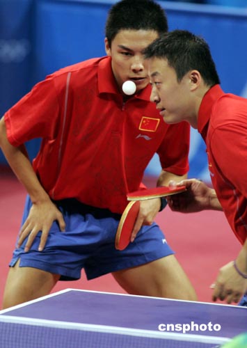 中國乒乓球選手馬琳、陳玘在男雙決賽中以4:1戰勝香港選手李靜、高禮澤,獲得本屆奧運會男子雙打冠軍。中新社記者:任晨鳴