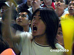中國臺北隊在雅典奧運會棒球賽中3:4惜敗日本隊,臺北球迷為之惋惜。中新社記者:曾嘉